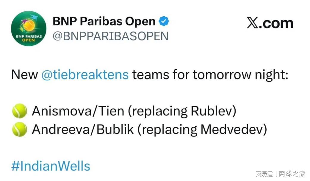 就在外界一直在等待梅德韦杰夫和卢布列夫是否已经顺利离开迪拜的最新消息时,印第安维尔斯官方的另一则新消息却提前来了,直接官宣取消了这对哥俩的混双抢十表演赛资格,由勒纳钱和布勃利克替代。